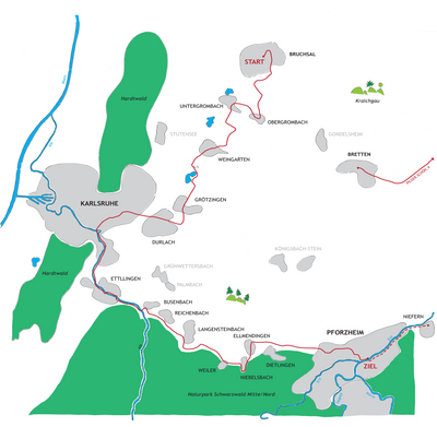 Die Region ist gut mit ÖPNV erschlossen, weshalb es möglich wäre, in Bahnhofsnähe Bruchsal oder Bahnhofsnähe Karlsruhe Quartier zu beziehen und dann die ersten drei Tagesetappen mit der S-Bahn anzusteuern.
